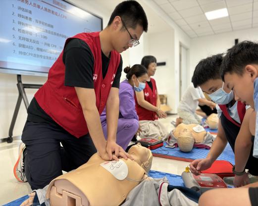 “按压深度至少 5 厘米,频率保持每分钟 100-120 次”—— 在导师们的手把手指导下,孩子们跪在模拟人旁反复练习心肺复苏,额角渗出的汗珠也顾不上擦。AED 操作演练时,当 “滴 —— 滴 ——” 的提示音响起,小家伙们屏住呼吸按下电极片,专注的神情丝毫不输专业人员。