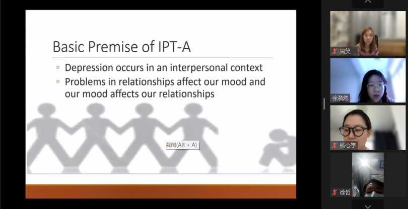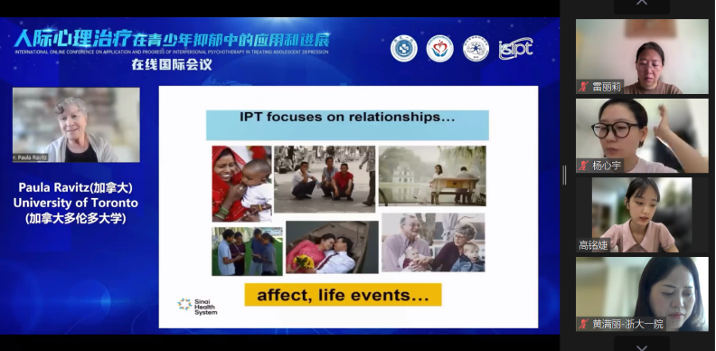 Later, Prof. Paula Ravitz, professor at the University of Toronto, gave a speech on the theory background and attachment in IPT. Prof. Meredith Gunlicks-Stoessel from University of Minnesota, talked about interpersonal psychotherapy in adolescent depression. These two talks were hosted by Prof. ZHENG Wanhong from West Virginia University.