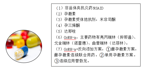2.药物治疗:包括抑制疼痛的对症治疗、抑制雌激素合成使异位内膜萎缩、阻断下丘脑-垂体-卵巢轴的刺激和出血周期为目的的激素治疗。主要分为非甾体类抗炎药(NSAID)、口服避孕药、高效孕激素、雄激素衍生物以及促性腺激素释放激素激动剂(GnRH-a)五大类。