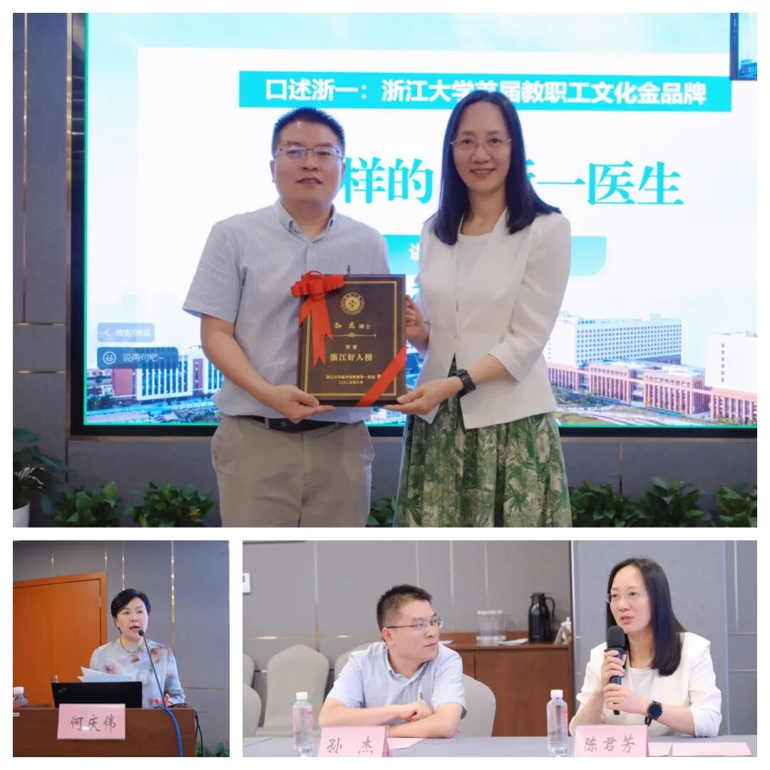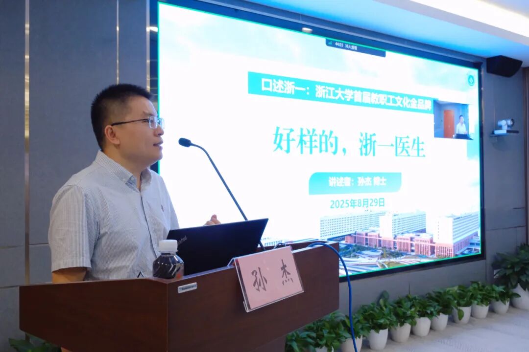 好样的,浙一医生 孙杰 博士 2025年8月29日下午,浙大一院第十三期“口述浙一”活动在庆春院区17号楼二楼钱塘厅正式启幕。活动以 “线上+线下” 同步形式开展,聚焦“医者初心与担当”,邀请荣登“浙江好人榜”的血液病科研究员孙杰博士,分享他纵身跃江救人及深耕科研的动人经历。党委副书记、纪委书记、工会主席陈君芳,血液科科室代表、相关职能科室代表、青年医护代表现场聆听了孙杰博士的动人故事。活动由工会副主席何庆伟主持。 陈君芳在致辞中指出,“口述浙一”作为浙江大学首届教职工文化金品牌,自创办以来便是医院传承精神、凝聚力量的核心载体——既记录着老一辈浙一人“严谨求实、拓荒前行”的奋斗足迹,也展现着新一代浙一人的时代风采。“浙一精神从不是墙上的文字,而是刻在骨子里的信念。孙杰钱塘江畔那惊心动魄的‘纵身一跃’,正是这份信念最鲜活的注脚。”她特别提到,孙杰的“下意识救人”,藏着浙一人“生命至上”的初心,更映照着医院七十八年精神传承的深厚底色。 随后进入颁奖环节,陈君芳代表医院为孙杰颁发“浙江好人榜”纪念牌。当沉甸甸的纪念牌递到孙杰手中时,现场响起了掌声。陈君芳强调,这份荣誉不仅是孙杰个人的荣光,更是全体浙一人的骄傲,是社会对医疗工作者“甘于奉献、大爱无疆”精神的高度认可。 颁奖结束后,孙杰以“口述”形式,娓娓道来在他成长过程中,那些对他影响深刻的人和事,并还原了那个令人揪心的暴雨夜。“我的家人,身边的同事、老师,都是非常认真负责、很有担当的,他们的言行对我有潜移默化的影响,让我也变得喜欢帮助人。”“2025年5月23日,复兴大桥下的钱塘江暗流汹涌,看到有人落水,我没多想就跳下去了。”他平静地讲述着救援细节:从六七米高的堤坝纵身跃入冰冷江水,在刺骨水流、体力透支与暗流威胁中,坚持托举八十公斤重的落水者二十余分钟——作为非专业救援者,他凭医者“救死扶伤”的本能扛起了生命重量。同时,孙杰还分享了自己在实验室与血液病“较劲”的日常:为破解疾病密码殚精竭虑、反复试验。两种场景的切换,让现场及线上听众清晰看到他“科研尖兵”与“平民英雄”的双重担当,也印证了“浙一人无论在诊室、实验室还是街头巷尾,‘救死扶伤’的使命永远在肩”。