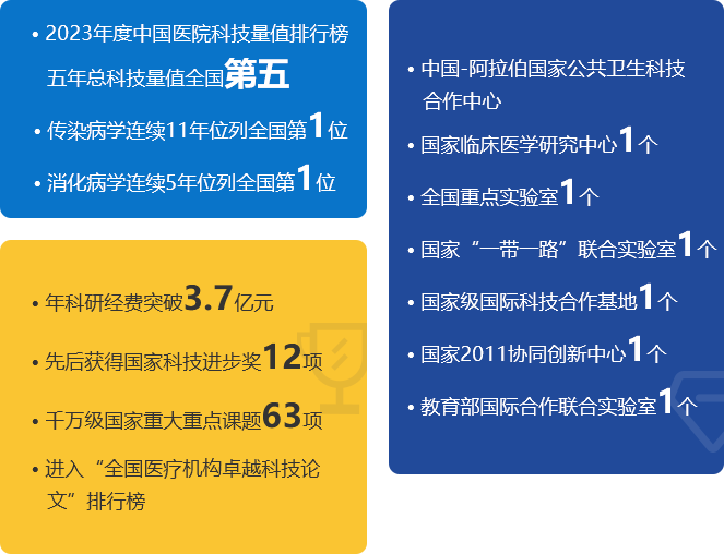 多年来,医院在传染病、器官移植、血液病、肾脏病、泌尿系统疾病、消化系统疾病、麻醉学、重症医学、临床药学等学科领域享有盛名。医院牵头全国重点实验室1个(传染病重症诊治全国重点实验室)、国家自然科学基金委基础科学中心1个、国家临床医学研究中心1个,教育部国际合作联合实验室1个,2025年医院获批中国-阿拉伯国家公共卫生科技合作中心。对标国际一流医学研究中心,浙大一院持续完善多维度创新平台体系,打造多院区同质化、规模化、整合型、开放式科研支撑体系,涵盖大型仪器共享平台、数据云存储平台、实验动物中心、生物样本库中心、生物大数据中心等平台,实现科研项目院内“一站式”解决。
